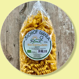 BIO Eier-Nudeln . . . natürlich hergestellt aus reinem Durum-Hartweizengries und 29 % BIO-Eiern. . . . natürlich geschmackvoll:Kleines Wellenband, Spirelli, Röschen, Dinkel-Spirelli