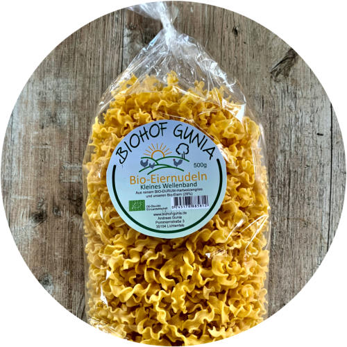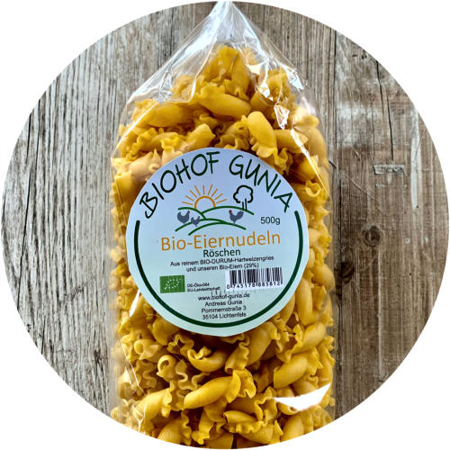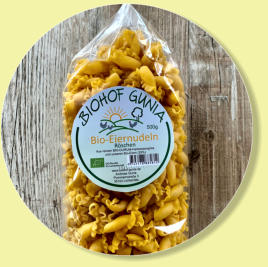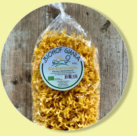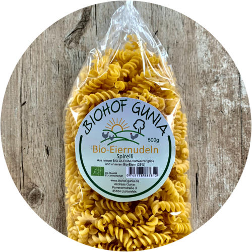 BIO Eier-Nudeln . . . natürlich hergestellt aus reinem Durum-Hartweizengries und 29 % BIO-Eiern. . . . natürlich geschmackvoll:Kleines Wellenband, Spirelli, Röschen, Dinkel-Spirelli